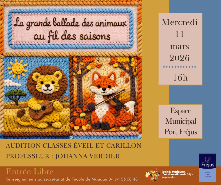 C’est avec grand plaisir que nous vous invitons à assister au spectacle « La Ballade des Animaux au fil des Saisons » des classes d’Éveil et de Carillon de notre professeur Johanna Verdier, qui se déroulera à la Salle Bateau (Espace Municipal et Culturel de Port Fréjus), mercredi 11 mars 2026 à 16h00. Nos petits élèves, musiciens en herbe vous invitent à découvrir leurs talents musicaux. Pour beaucoup, il s’agit de leur première représentation publique, nous vous invitons à venir les nombreux pour les encourager.